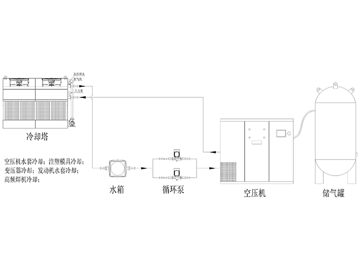 空壓機(jī)水套、注塑模具、變壓器、發(fā)動(dòng)機(jī)水套用閉式循環(huán)系統(tǒng)。
