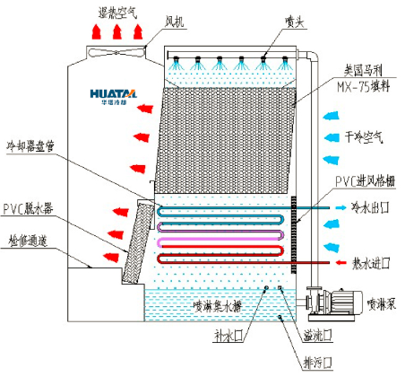2021/07/03密閉式冷卻塔的工作原理。1、密閉式冷卻塔實(shí)際上是一種蒸發(fā)式冷卻塔,冷卻器和濕式冷卻塔的組合,它是臥式的蒸發(fā)式冷卻塔,工藝流體在管內(nèi)流過,空氣在管外流過,兩者互不接觸。與工藝式流體熱水或制冷劑和管外空氣并不接觸,成為一種閉式冷卻塔,通過噴淋水增加傳熱傳質(zhì)的成效。2、密閉式冷卻塔適用于對(duì)循環(huán)水質(zhì)要求較高的不同冷卻系統(tǒng),在電...
