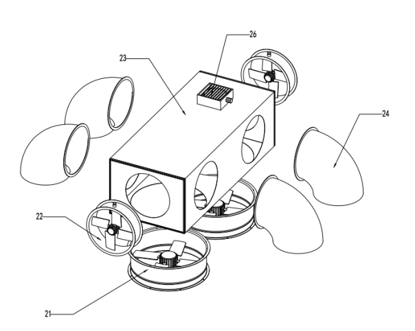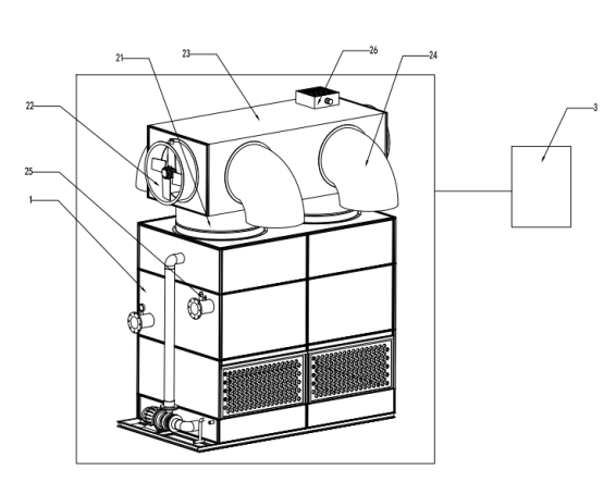 該冷卻塔帶有聯(lián)合消霧排風(fēng)系統(tǒng)2,通過PLC控制器3控制聯(lián)合消霧排風(fēng)系統(tǒng)2的運行,一方面即使在寒冷的冬季,外界溫度較低,塔內(nèi)濕熱空氣濕度較大的情況下,通過熱空氣主風(fēng)機21及冷空氣副風(fēng)機22的共同作用也可以避免冷卻塔產(chǎn)生白霧的現(xiàn)象,運行更環(huán)保,另一方面,外界溫度較低,塔內(nèi)濕熱空氣濕度不大的情況下,開啟冷空氣副風(fēng)機22排風(fēng)即可,節(jié)能環(huán)保;引風(fēng)筒24為弧形結(jié)構(gòu)并且出風(fēng)口向下更有利于冷卻塔產(chǎn)生的氣體排出。