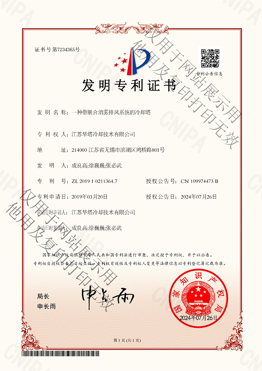 江蘇華塔經(jīng)過多次試驗,研發(fā)了一種帶聯(lián)合消霧排風(fēng)系統(tǒng)的冷卻塔,從而克服上述現(xiàn)有技術(shù)中的缺陷,并取得了專利。
