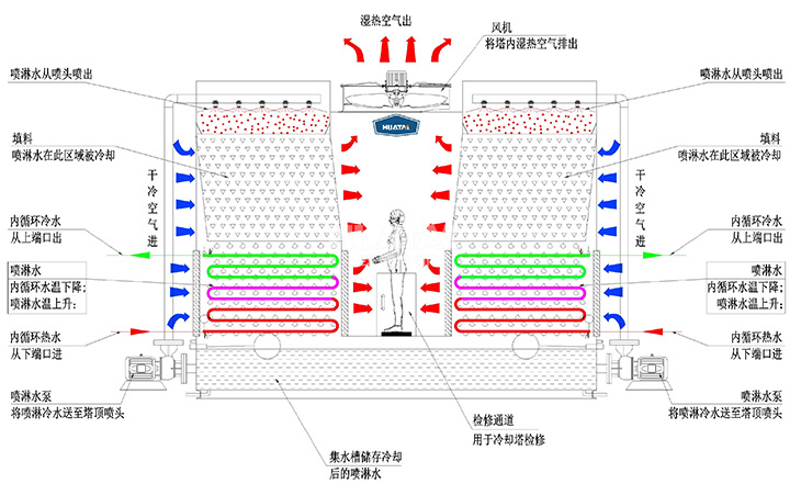 工作流體(純水或其它液體)在閉式冷卻塔的盤管中循環(huán),工作流體的熱量經(jīng)過盤管散入流過盤管的水中。同時機組外的空氣從雙側(cè)面上的進風格柵進入,與水的流動方向垂直,橫向流經(jīng)盤管一小部分水蒸發(fā)而吸走熱量,熱濕空氣由冷卻塔頂部的排風機排到大氣中。其余的水則落入底部水槽中,由水泵再循環(huán)至水分布系統(tǒng)經(jīng)過預冷填料又淋回到盤管上。